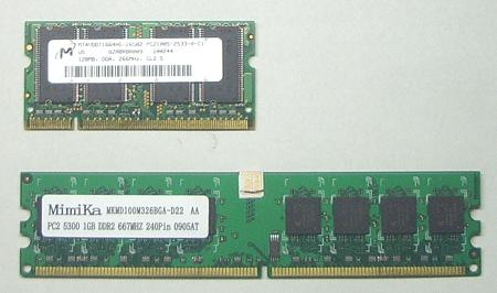 ![]() RAM の例 機種によっていろいろなタイプがあるので、購入には注意が必用です。 上はノートパソコン用 下はデスクトップ用 |
