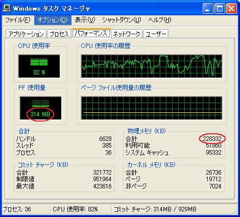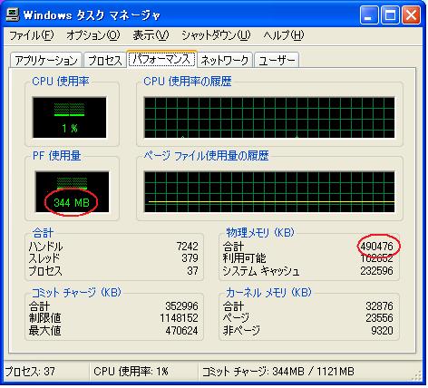 ![]() メモリーが足りている例 必用メモリ量 344MB 装備されているメモリー 490MB(実際には512MB) |